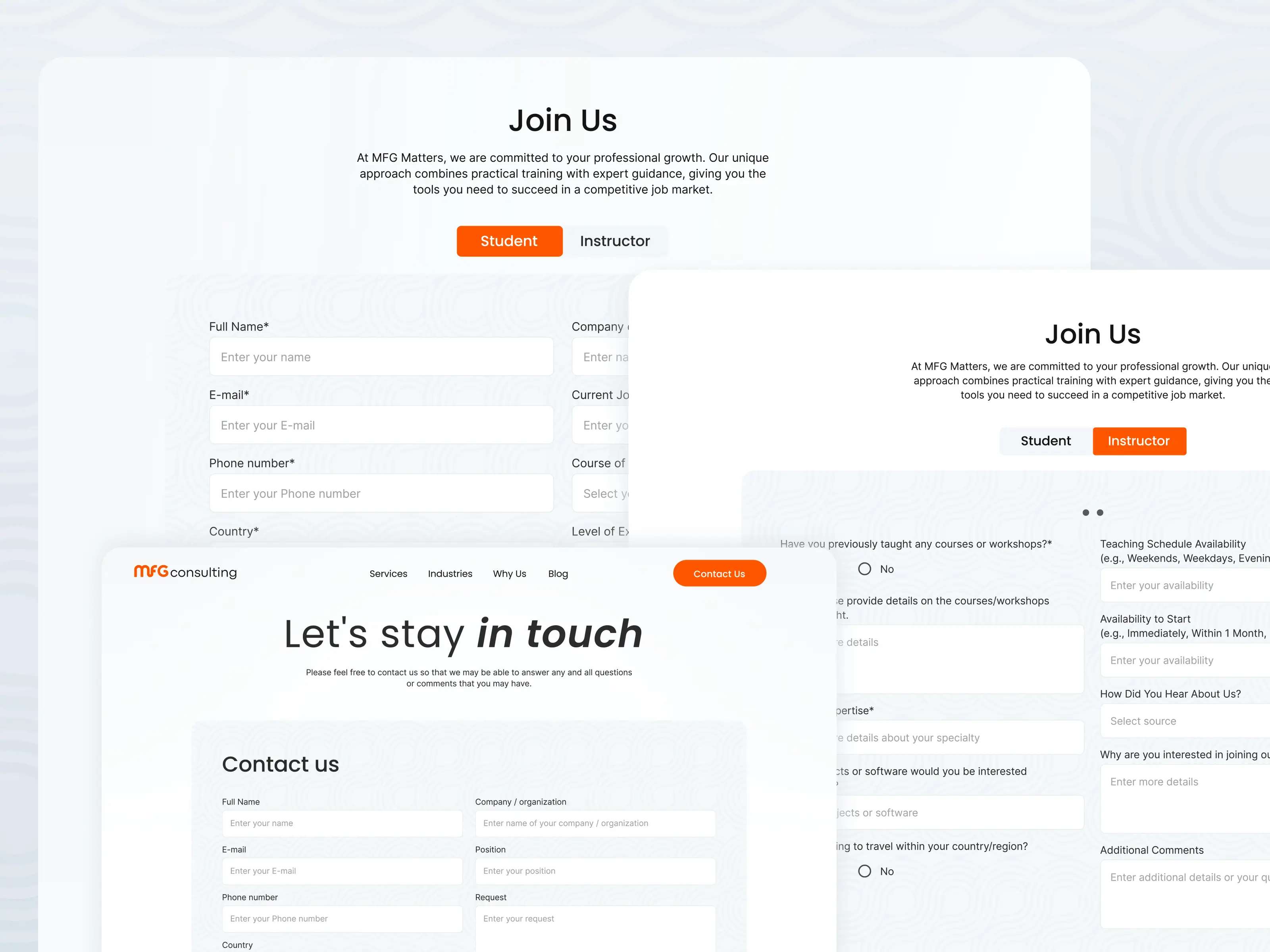 3. Learning Pages: developing dual-purpose contact forms for both students and instructors of Learning part of MFG. Adding options to expand pre-scheduled programs in the future.